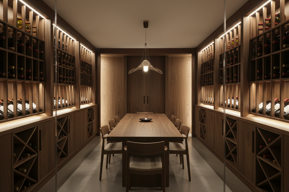 From small reach-in cellars to full glass-enclosed showcases, our U.S. design team provides free concepts, CAD drawings, and complete wine room layouts — all built with premium American-made materials.